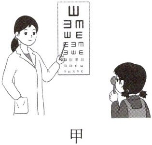 3. “爱眼护眼正当行,视力普查展文明。”为了给早预防、早发现、早治疗提供预警信号和可靠依据,共同呵护眼部健康,某兴趣小组开展了以下实践活动。图甲为视力筛查场景图,图乙为眼球成像示意图。请分析并回答下列问题。