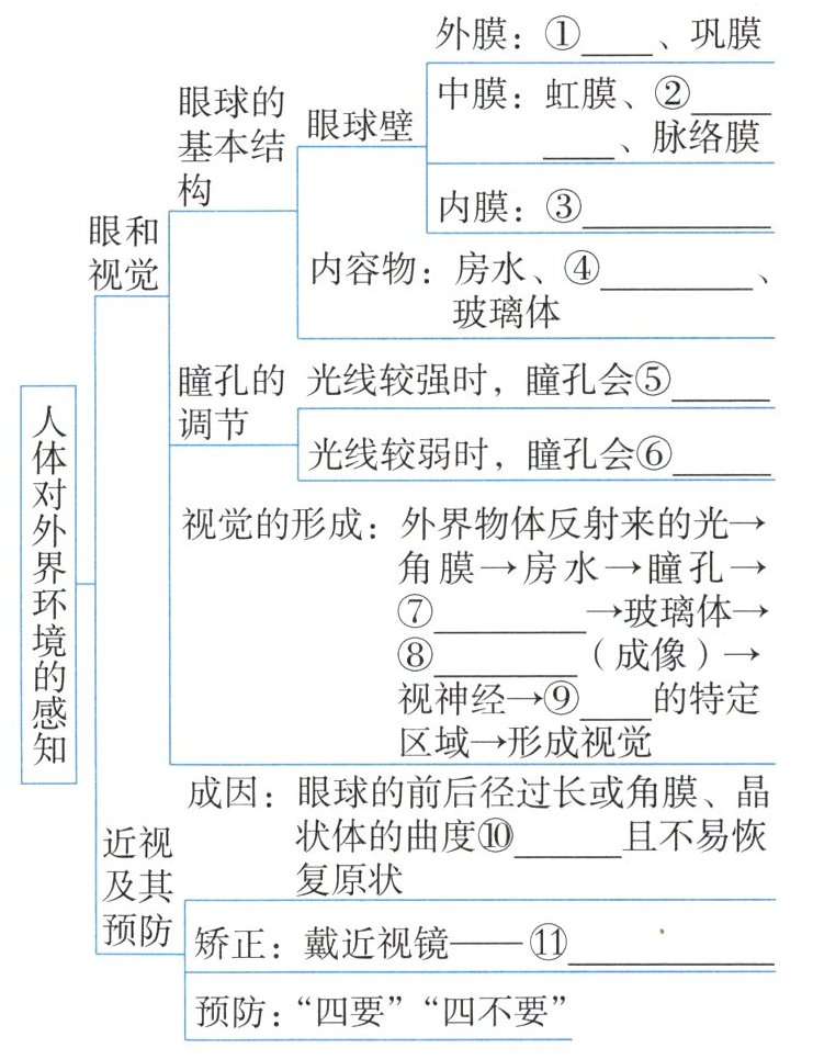 (4)由黑暗环境到明亮环境,为了减少进入眼内的光量,瞳孔会由大变小。