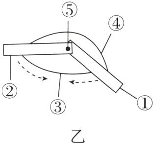 A 解析:甲图中,动作①到动作②的过程是伸肘过程,此时肱二头肌舒张,肱三头肌收缩,A项错误;乙图中,⑤模拟关节,关节具有既牢固又灵活的特点,B项正确;做屈肘动作时,肱二头肌收缩,肱三头肌舒张,乙图中④肱三头肌舒张,③肱二头肌收缩牵动①②骨绕⑤关节活动,可模拟完成屈肘动作,C项正确;运动并不是仅靠运动系统来完成的,还需要神经系统的调节,运动的能量供应,有赖于消化系统、呼吸系统、循环系统等系统的配合,D项正确。