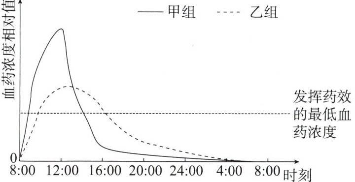 7. (新情境分析)布洛芬是一种解热镇痛类药物。为研究如何科学用药,研究人员将生理状况相同的小鼠均分为甲、乙两组,而后给甲组小鼠服用布洛芬片剂,给乙组小鼠服用相同剂量的布洛芬缓释胶囊。两组小鼠均于上午8:00服药并定时抽血,血药浓度结果如下图所示。请完成第(1)~(2)题。