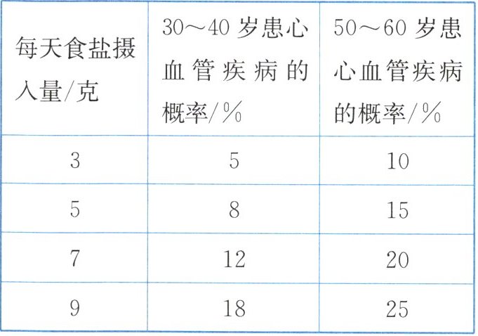 10. 下表所示为不同年龄段人群患心血管疾病的概率与每天食盐摄入量的关系。对于50~60岁人群,下列说法正确的是(