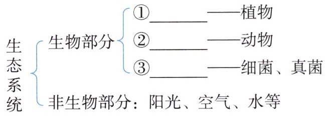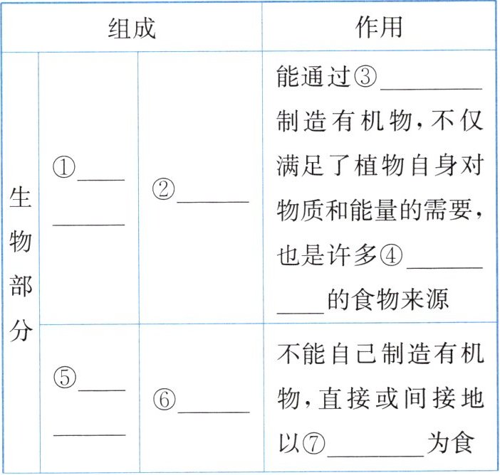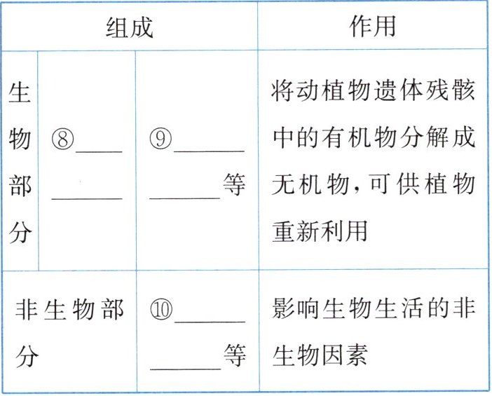 1. ①生产者 ②植物 ③光合作用 ④动物 ⑤消费者 ⑥动物 ⑦植物 ⑧分解者 ⑨细菌、真菌 ⑩阳光、空气、水 2. 相互依存、相互制约