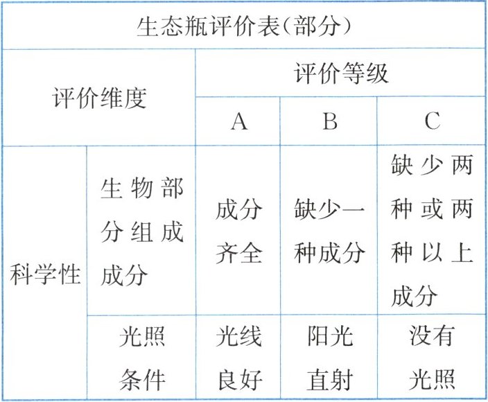 。(3) 实践过程中,某同学制作的生态瓶如下图所示。根据生态瓶评价表(部分)中“生物部分组成成分”一栏判断,该生态瓶的评价等级为