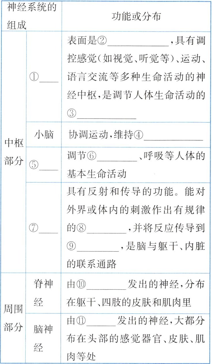 ①大脑 ②大脑皮层 ③最高级中枢 ④身体平衡 ⑤脑干 ⑥心跳 ⑦脊髓 ⑧反应 ⑨大脑 ⑩脊髓 ⑪脑