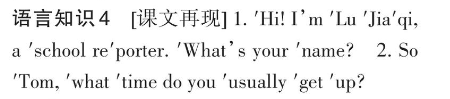 课文再现 1. Hi! I'm Lu Jiaqi, a school reporter. What's your name?(标记应重读的单词)