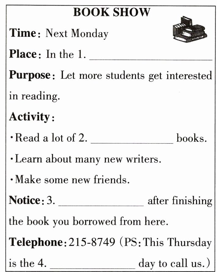 after finishing the book you borrowed from here.| ||Telephone:215-8749 (PS:This Thursday is the 4.