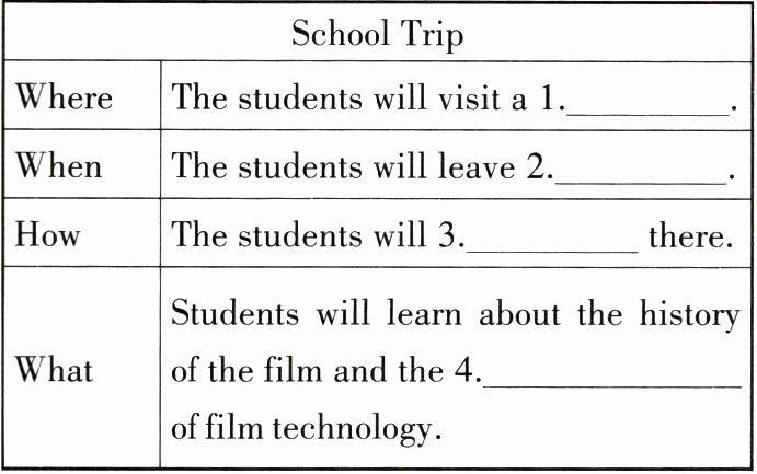 (听力材料缺失,此答案仅为推测。)1. museum;2. at 8:00 a.m.;3. take the bus;4. development