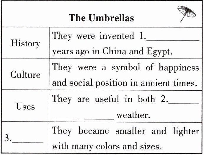 (听力材料缺失,此答案仅为推测。)1. thousands of 2. sunny and rainy 3. Development 4. cultural meaning