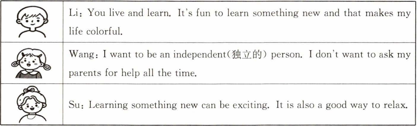 | | Wang:I want to be an independent(独立的)person. I don’t want to ask my parents for help all the time. |