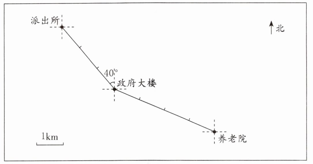 (3)电影院在派出所南偏西$40^{\circ}$方向1km处,请用“○”在图上标出来。