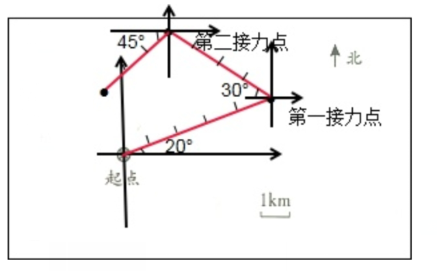下面是某地老年运动会骑自行车环湖接力赛中的一段赛程:1号骑手从起点沿东偏北$20^{\circ}$方向行5km到达第一接力点;2号骑手从第一接力点沿西偏北$30^{\circ}$方向行4km到达第二接力点;3号骑手从第二接力点沿西偏南$45^{\circ}$方向行3km到达第三接力点。你能按前面的描述画出路线图吗?