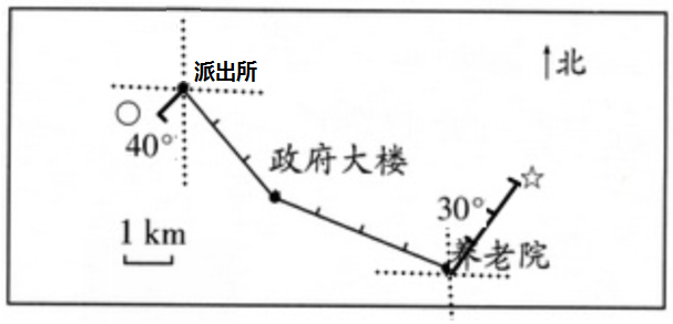 (2)花鸟市场在养老院北偏东$30^{\circ}$方向3km处,请用“☆”在图上标出来。