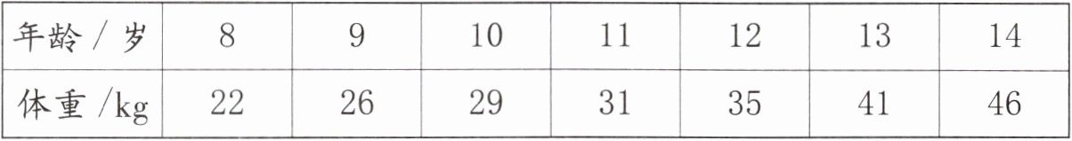 贝贝 8~14 岁每年生日时的体重统计表