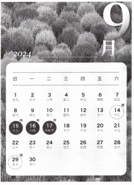 二、Look and judge. 下面是2024年九月份的月历图。请你看一看,判断下列说法与图片是(√)否(×)相符。