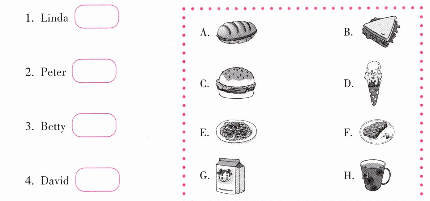 一、Listen and choose. 午餐时间到了。Linda和朋友们来到了学校餐厅。他们想要什么食物或饮品呢?请你听一听,根据所听内容,选择相应的图片。
