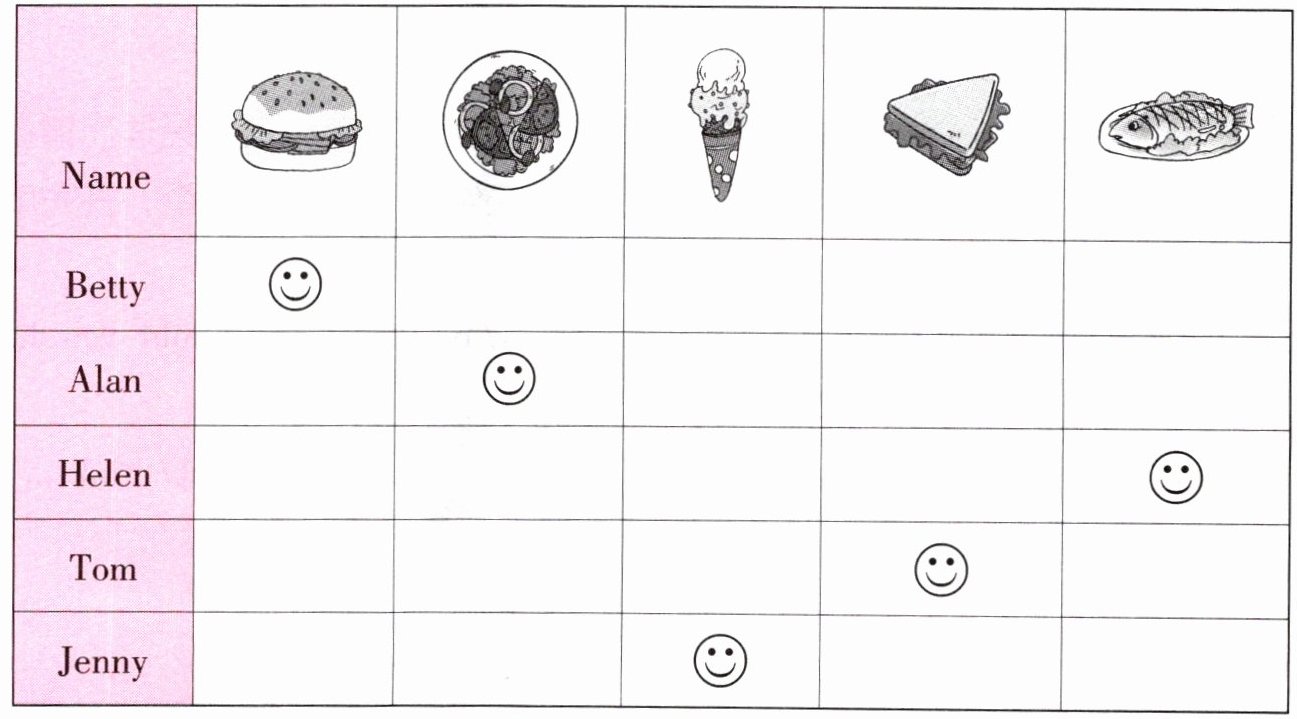 二、Look and fill in the blanks. Lucy对自己朋友们喜欢的食物进行了调查,并制成了下面的表格。请你看一看,根据表格内容补全句子。