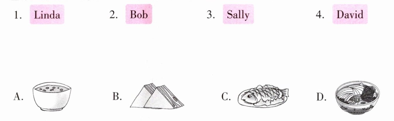 一、Listen and match. 学校餐厅今天有许多美味的食物。同学们正在谈论各自喜欢的食物。请你听一听,将人物与相应的图片连线。
