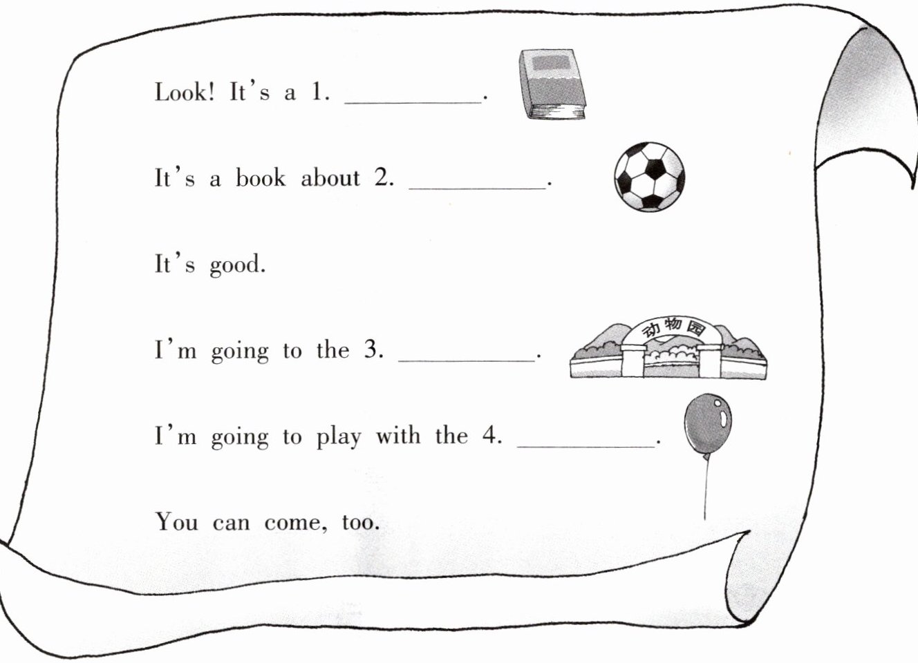 三、Read and write. Ben在班会上展示了一段英文说唱。请你读一读,根据图片提示,在横线上填写适当的单词,每空一词。