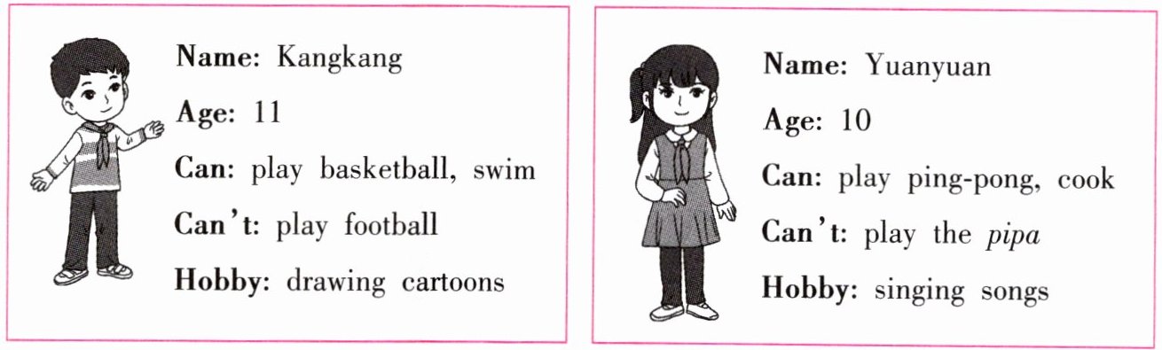 四、Read and say. 你在参加社团活动时认识了新朋友Kangkang和Yuanyuan。请你读一读他们的个人信息,并向好朋友简单介绍一下他们吧。