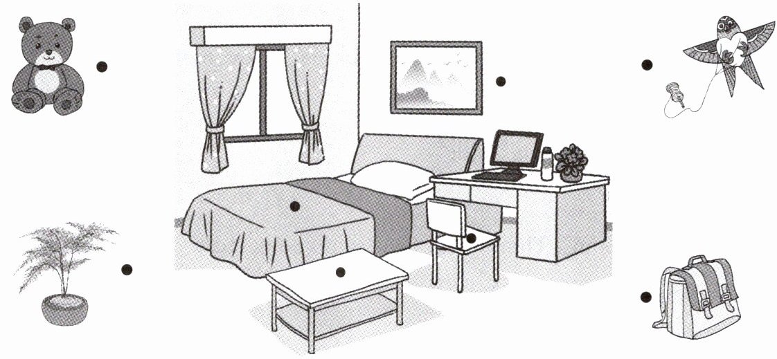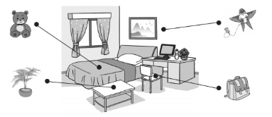 一、Listen and match. Linda今天刚搬到新家。她的新卧室里有什么呢?请你听一听,将物品与相应的位置连线。
