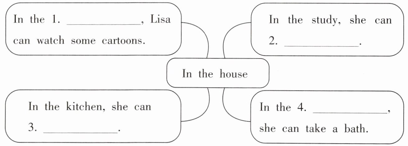 三、Read and finish. 周末,Lisa去看望住在农村的爷爷奶奶。她正在介绍爷爷奶奶的房子。请你读一读,根据短文内容完成思维导图。
