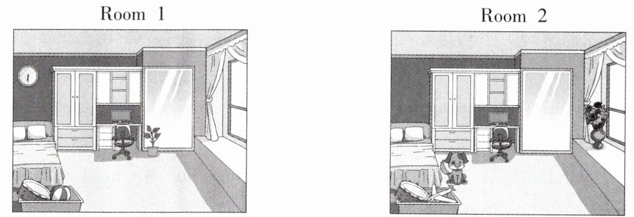 2. Room 1 书桌旁有一盆植物,Room 2 没有。