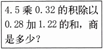 (2) $ 4.5 $ 乘 $ 0.32 $ 的积除以 $ 0.28 $ 加 $ 1.22 $ 的和,商是多少?