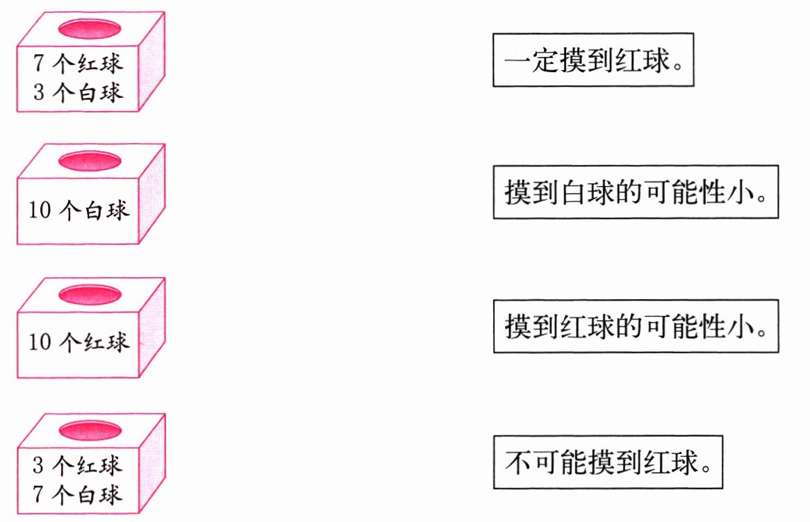 从左到右,从上到下依次连:摸到白球的可能性小;不可能摸到红球;一定摸到红球;摸到红球的可能性小。
