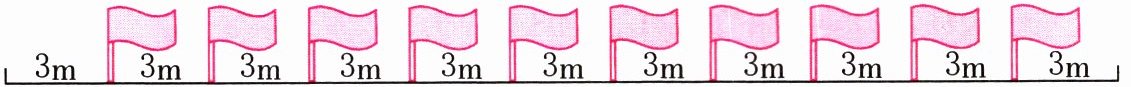 2. 操场旁边的一条小路一侧插着 10 面彩旗,每相邻两面彩旗之间的距离是 3m(两端都不插,如下图)。这条小路有多长?