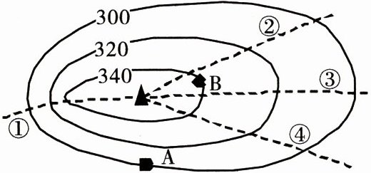 6. 在图中①②③④这四条路线中,坡度最陡的是( )。