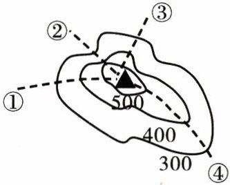 4. 某班学生计划分成四个登山小组沿图中的①②③④虚线方向攀登山峰。其中一组想沿坡度较陡的山谷攀登,其路线是( )。