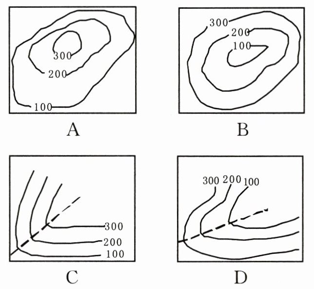 4. 下列各图中,表示山脊的是( )。