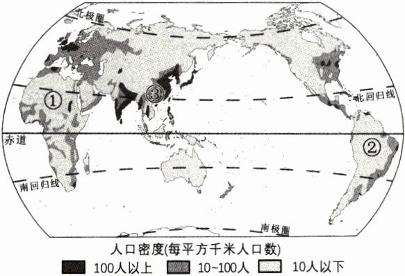 (1)①②③所表示的地区中,人口比较稠密的是____,当地优越的自然条件有____。比较稀疏的是____,因为当地的自然条件是:____。