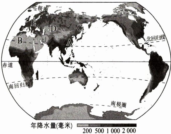 (2)A地与B地都在______(填纬线)附近,A地年平均降水量是______,B地是______。