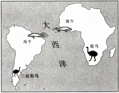 1. 海牛栖息在热带浅海中;鸵鸟生活在陆地上,但不会飞,它们都没有远涉大洋的能力。请你参考右边海牛和鸵鸟的分布示意图,解释它们为什么会分布在大西洋两岸。(2 分)
