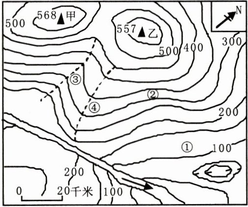 (4)甲、乙两山的相对高度是____米;若图上两处距离为2.5厘米,则实际距离为____千米。