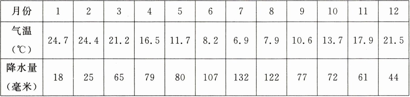 |气温(℃)|24.7|24.4|21.2|16.5|11.7|8.2|6.9|7.9|10.6|13.7|17.9|21.5|