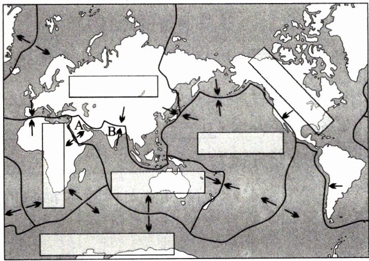 (1)将亚欧板块、美洲板块、非洲板块、南极洲板块、太平洋板块和印度洋板块的名称填入图中适当位置。(3分)