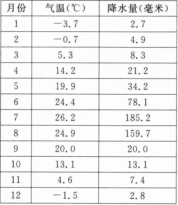 |月份|气温(℃)|降水量(毫米)|