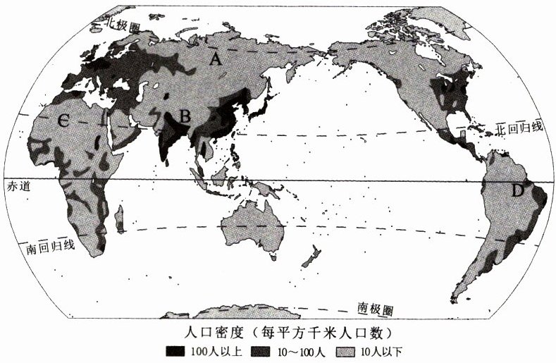 7. 读下面世界人口分布图,回答问题:(10分)
