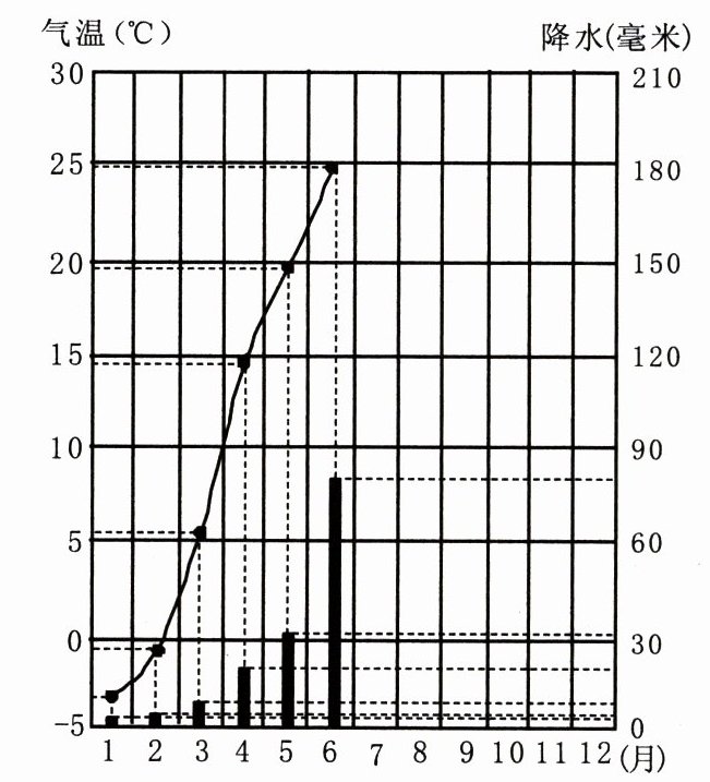 6. 请根据下表中提供的某地气温、降水资料,仿照1-6月的画法绘出7-12月的气温和降水量,完成该地气温曲线降水量柱状图。(6分)
