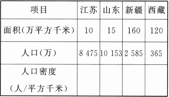 9. 热点题 计算表中四省区的人口密度,并完成填空。(注:表中人口数量为 2020 年统计数据)