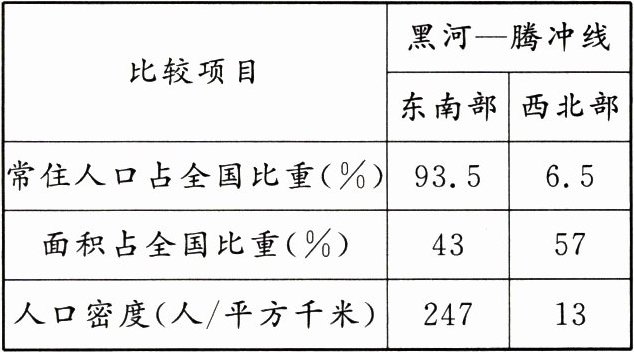 (2)黑河—腾冲线东南部常住人口约是西北部的____倍(保留到整数位)。