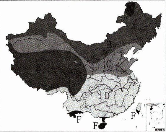 图中字母分别代表热带、亚热带、暖温带、中温带、寒温带和高原气候区中的一种。请选择填写在下列横线上: