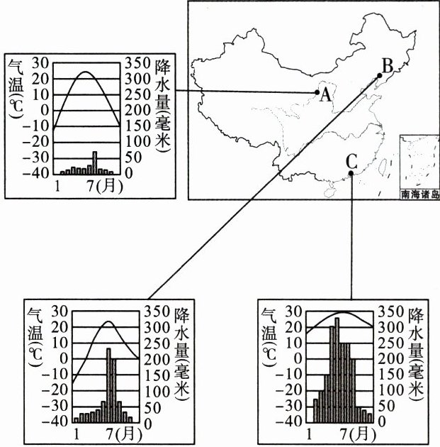 (2)在我国各干湿区中,A市处于______区、C市地处______区;在我国各温度带中,B市地处______带。