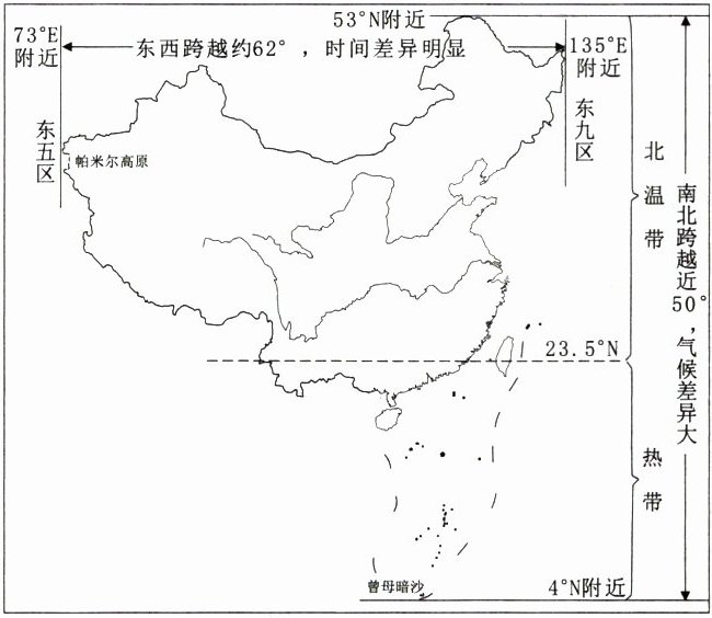 (1)根据图中提供的信息分析我国纬度位置的特点及优越性。