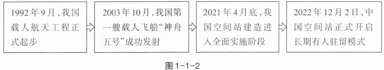 从无人飞行到载人飞行,从一人一天到多人多天,从舱内实验到出舱活动,从单船飞行到空间站巡天,中国太空探索用 30 年跨越了发达国家半个世纪的发展历程。图 1 - 1 - 2 为同学们根据老师提供的资料整理的中国太空探索成就。据此完成 9 ~ 10 题。