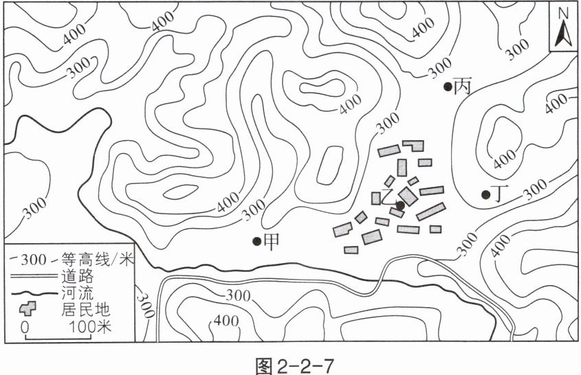 [2024·广东(有删改)]近年来,我国物流业迅速发展,快递点进村已成为新的趋势。图 2-2-7 为我国北方地区某村及其周边等高线地形图。据此完成 1~2 题。