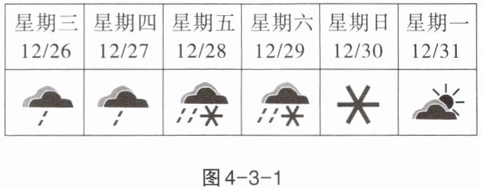家住河南郑州的小娟学习完“降水的变化与分布”一课后,想要探究自己家乡的降水情况。读图4-3-1“郑州市某年12月26—31日天气预报图”,完成1~2题。