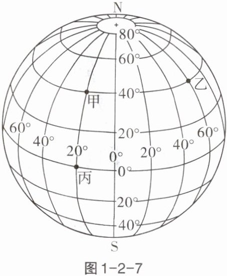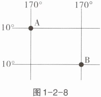 16. 读“经纬网图”(图 1-2-8),图中 A、B 之间经度差和纬度差均为 20°,回答下列问题。